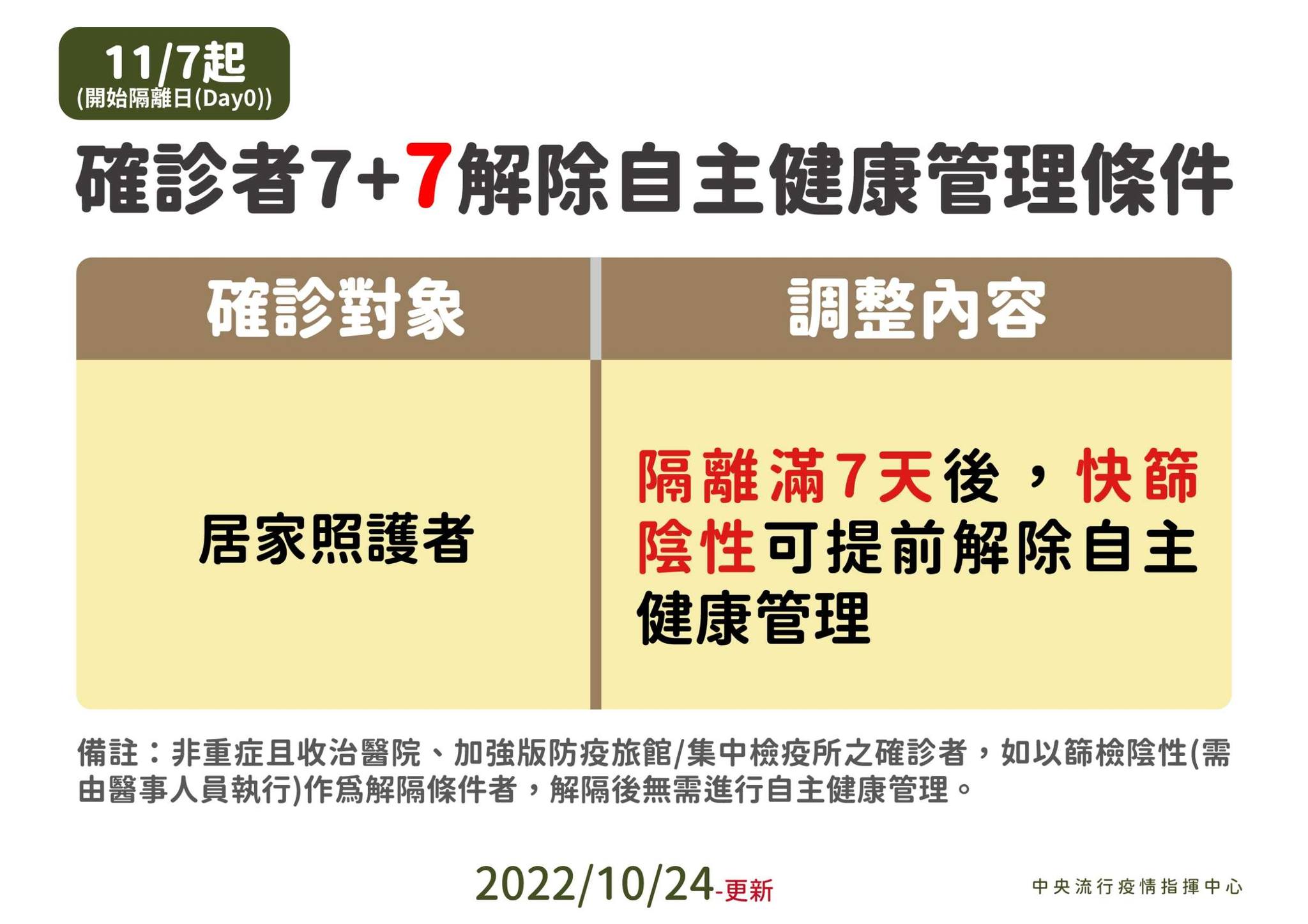 確診者從原先的「7+7」改為「7+0」,意旨確診者確診隔離滿七天後,快篩陰性可提前解除自主健康管理,不需要再自主健康管理了!